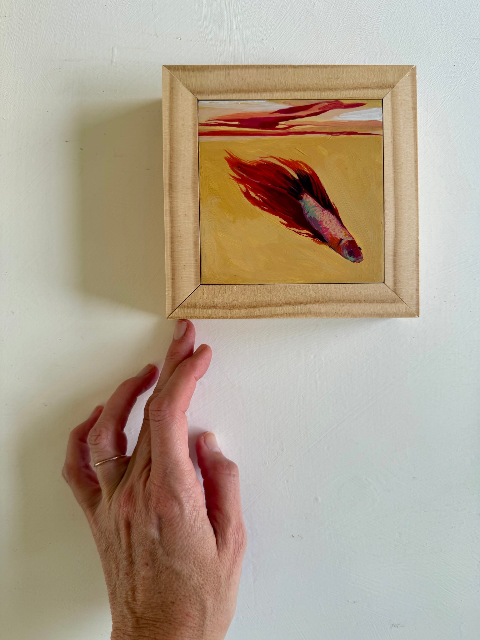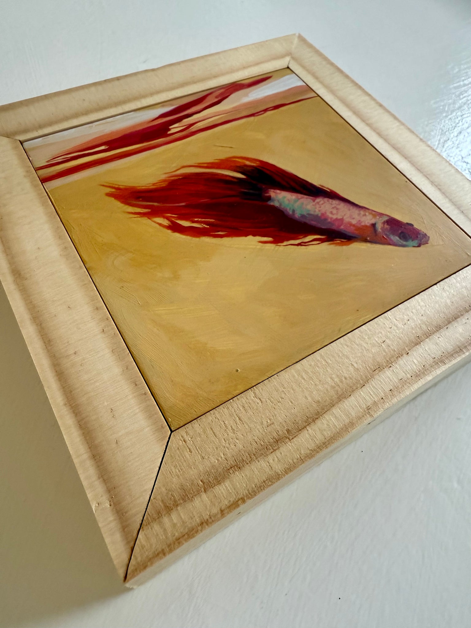 A collection of gem like paintings, using brilliant colours to express the saturated tones of the fish. Each piece is in oil, signed on the reverse with a frame and wire, ready to hang on the wall.
